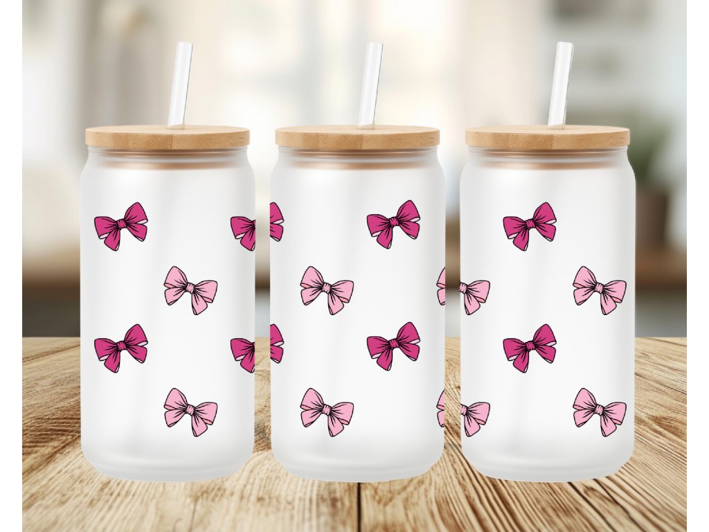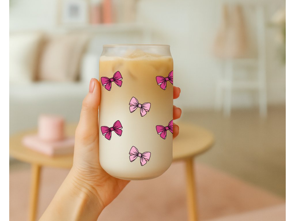 Sklenice s potiskem růžových mašliček je ideální volbou pro každého, kdo miluje jemné motivy a stylové doplňky. Je skvělá na ledovou kávu, limonádu, čaj i smoothie a zároveň se stane krásným doplňkem pracovního stolu, kuchyně nebo pikniku s přáteli.