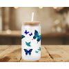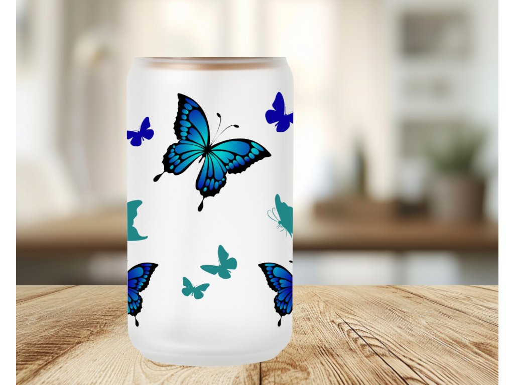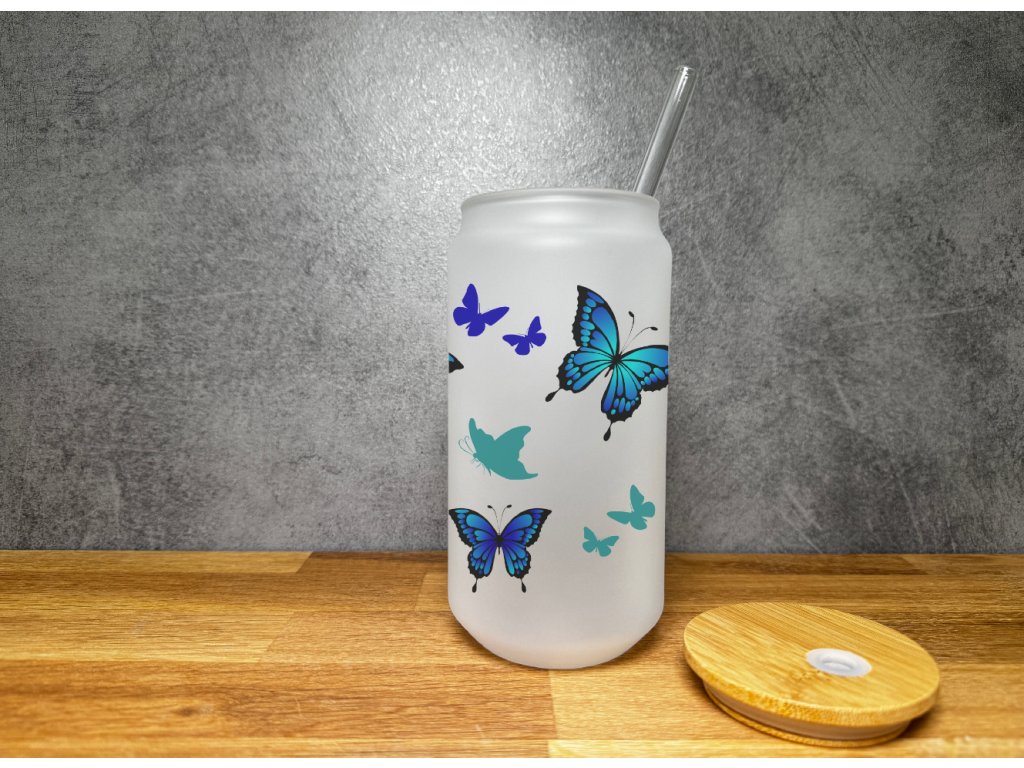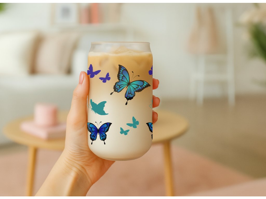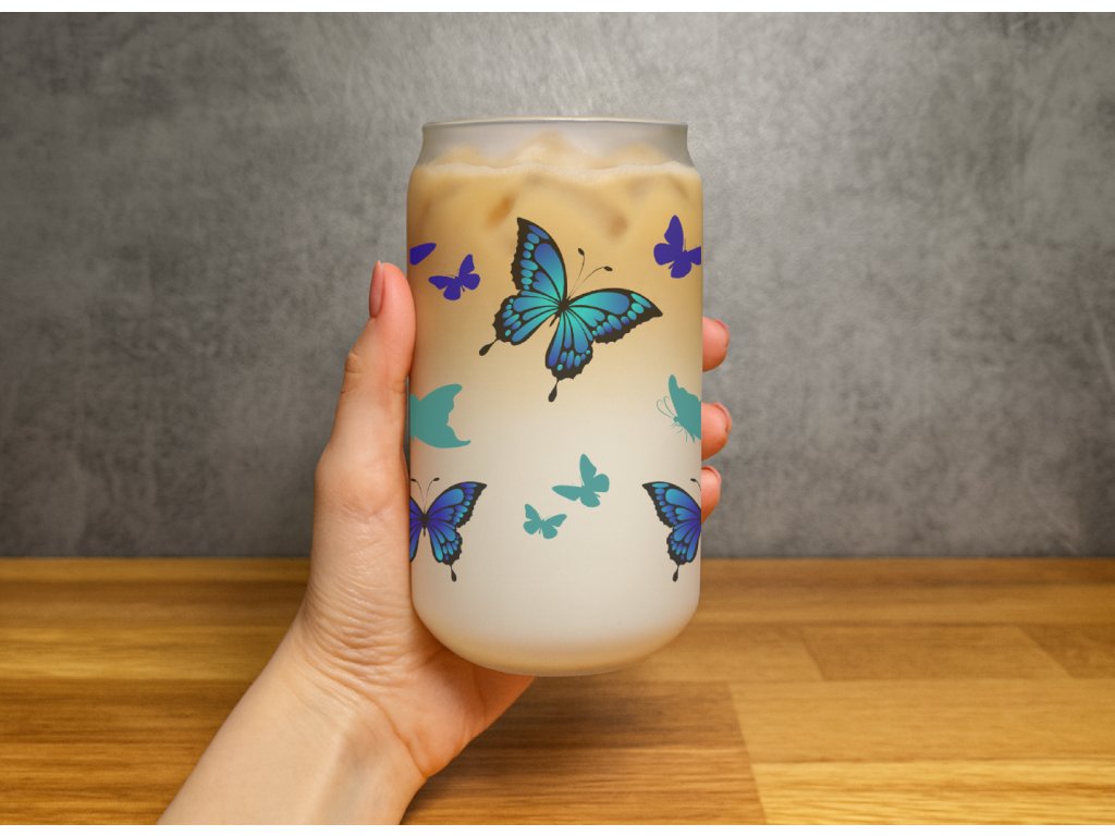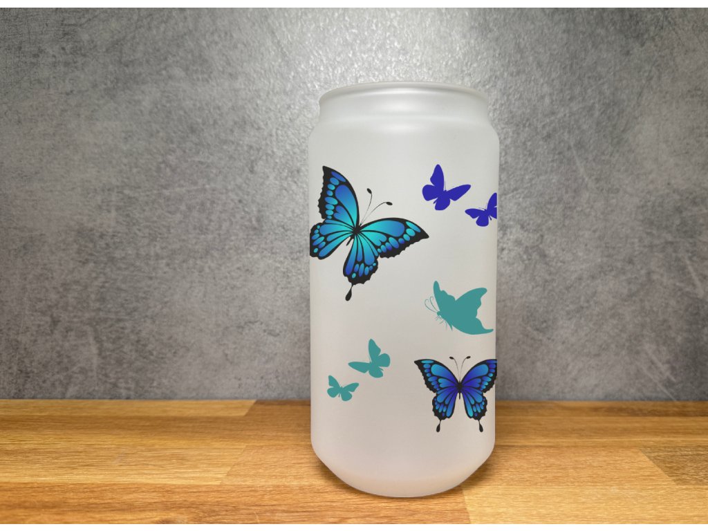 550 ml - Sklenička na kávu ve tvaru plechovky - Motýlci - modrá