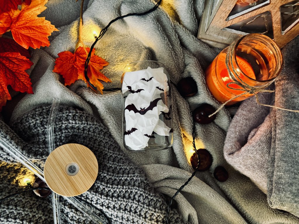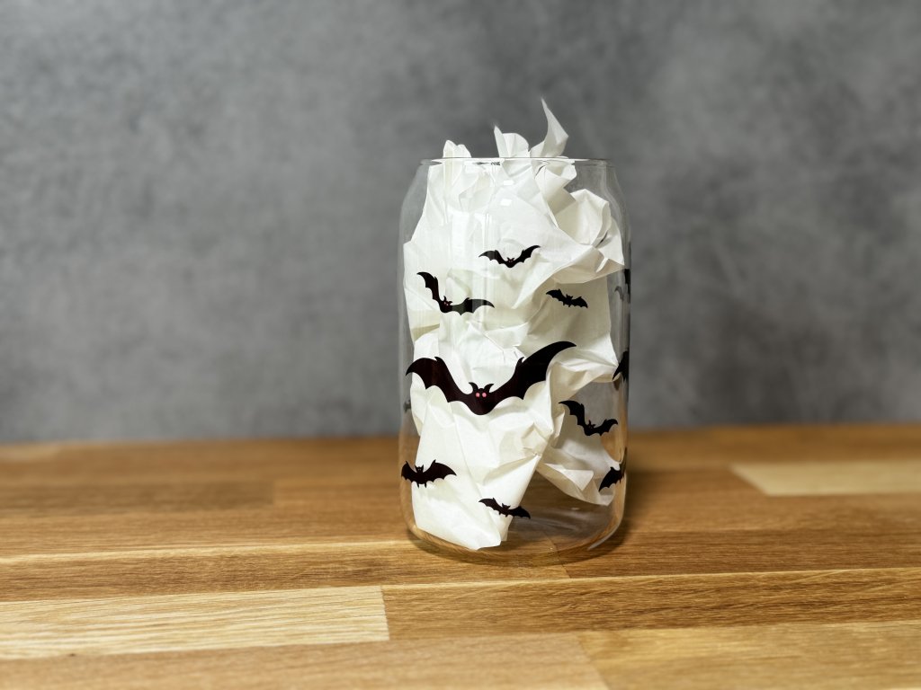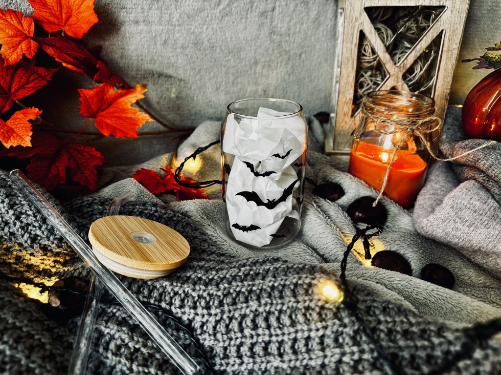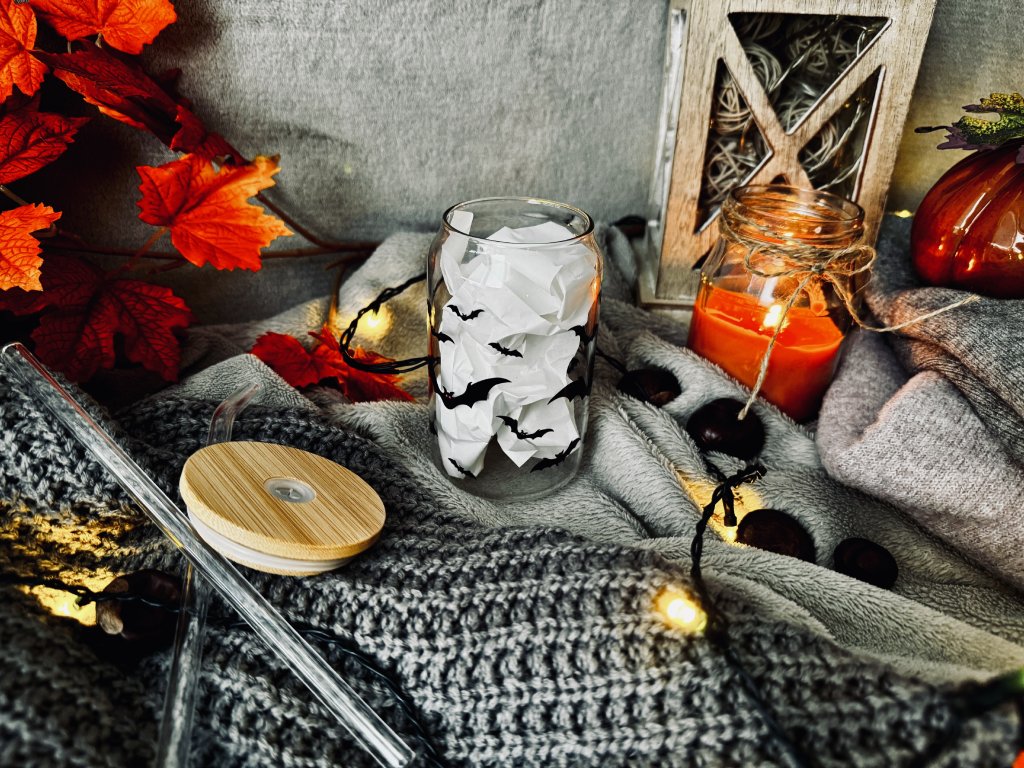 Sklenička s motivem černých netopýrů je hravá, trochu děsivá a zároveň roztomilá – přesně tak, jak má být podzimní design s charakterem.