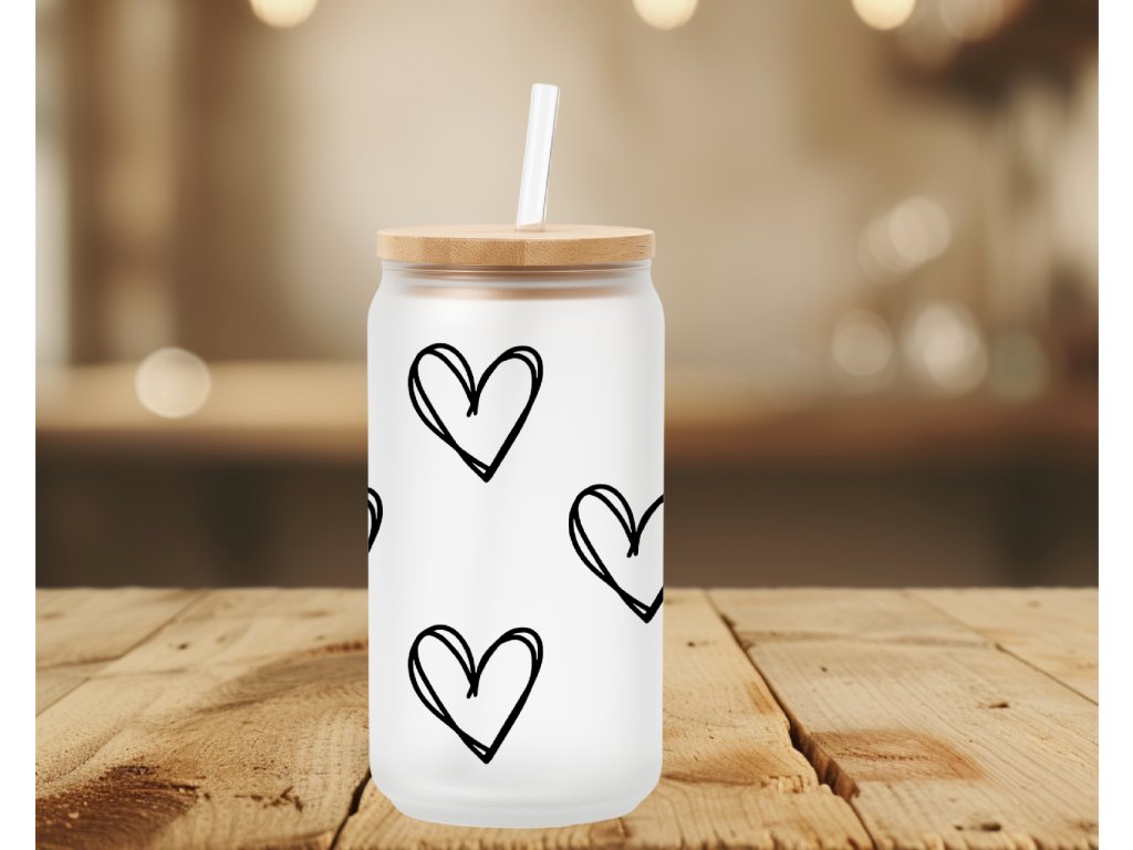 550 ml - Stylová matná sklenička s černými srdíčky 🖤 ideální pro všechny milovníky minimalismu a detailů. Dostupná samostatně nebo v setu s víčkem a brčkem.