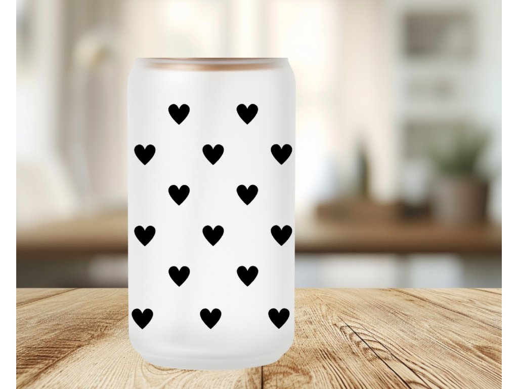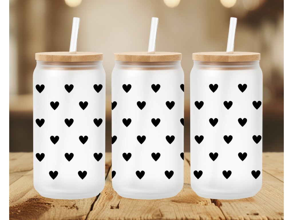 550 ml - Stylová matná sklenička s černými srdíčky 🖤 ideální pro všechny milovníky minimalismu a detailů. Dostupná samostatně nebo v setu s víčkem a brčkem.