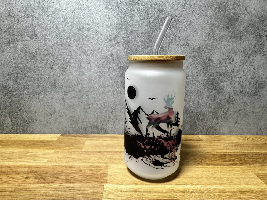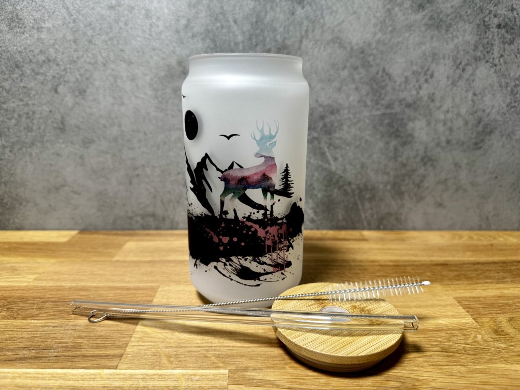 - Sklenička s potiskem + bambusové víčko, skleněné brčko a čistící kartáček – ideální pro stylové pití