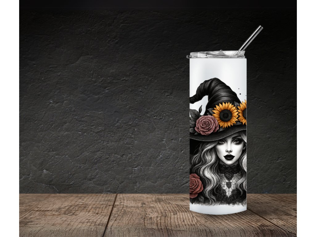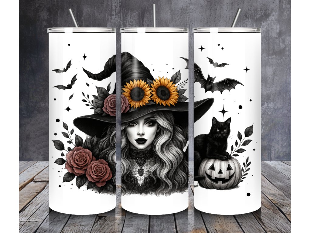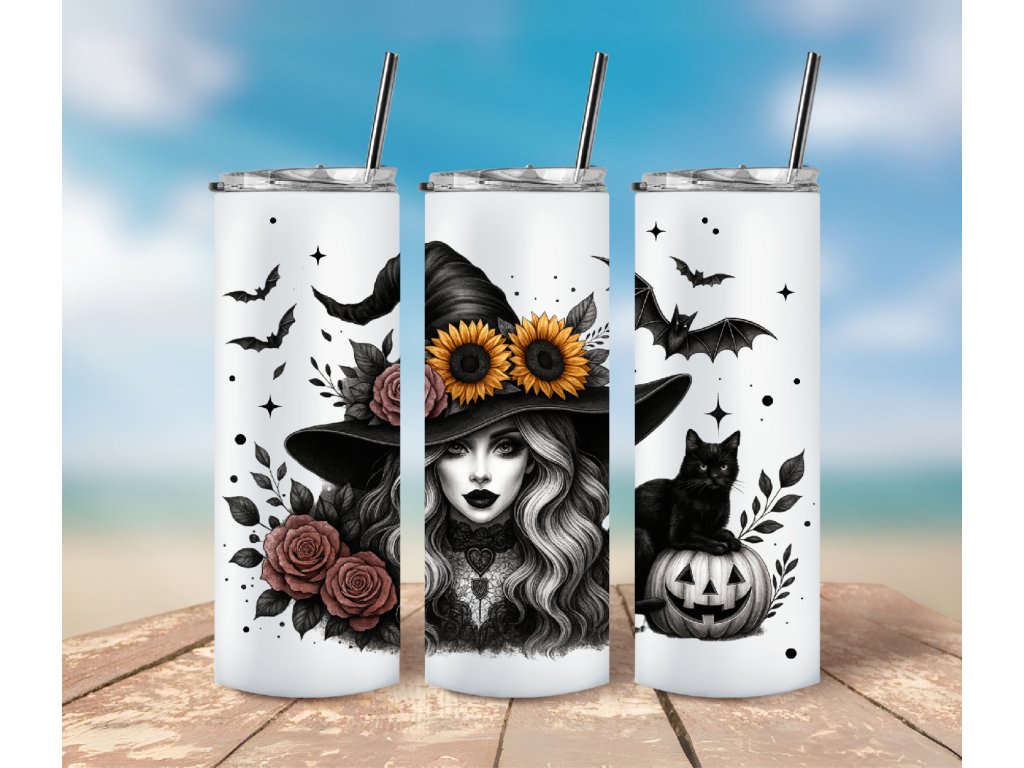 Objevte kouzelnou atmosféru podzimu s tímto originálním Halloweenským termo kelímkem s čarodějkou. Design s krásnou witch čarodějničí ozdobenou květinami, černou kočkou na dýni 🎃 a netopýry v pozadí vytvoří jedinečný doplněk pro každého milovníka Halloweenu.