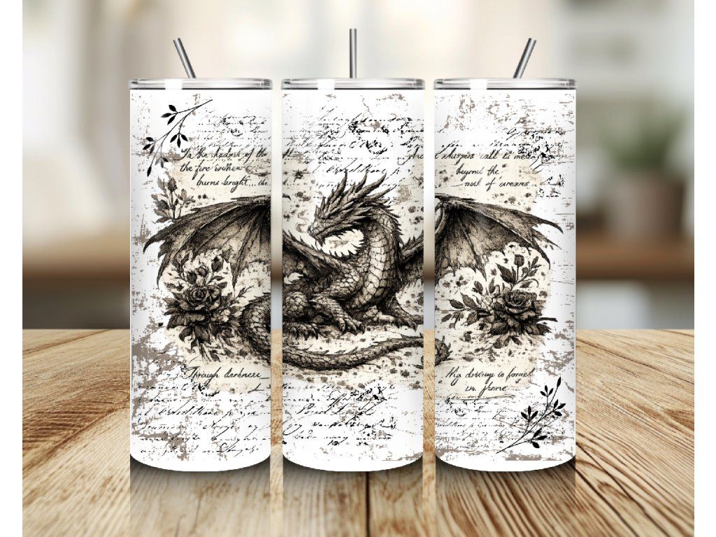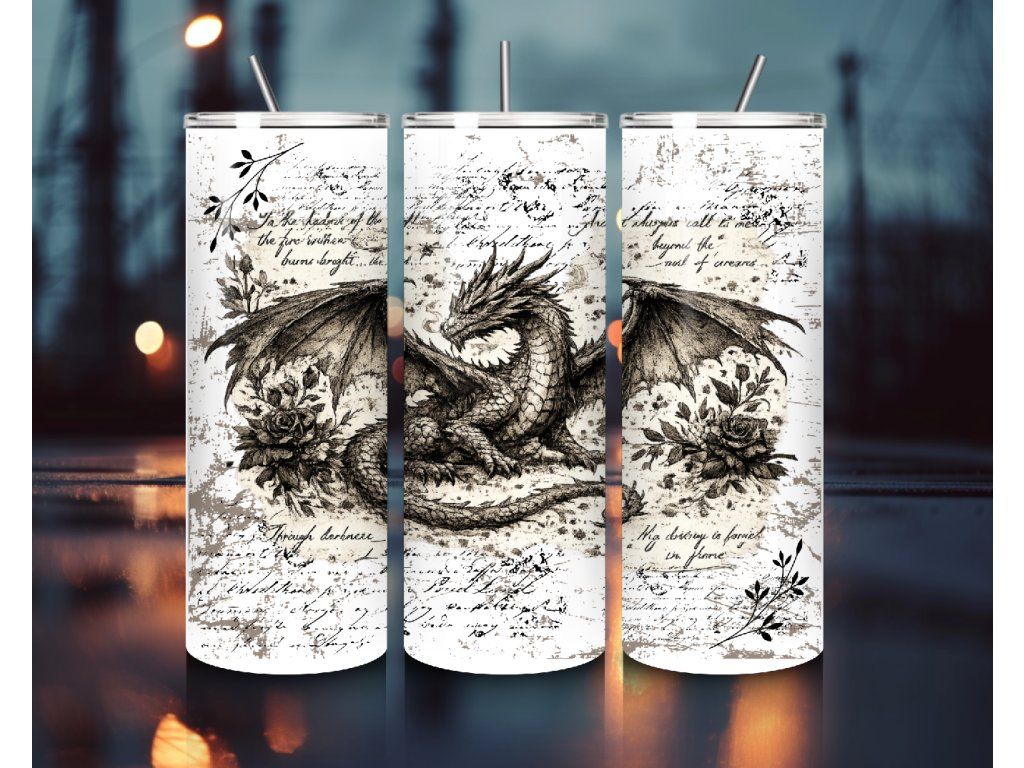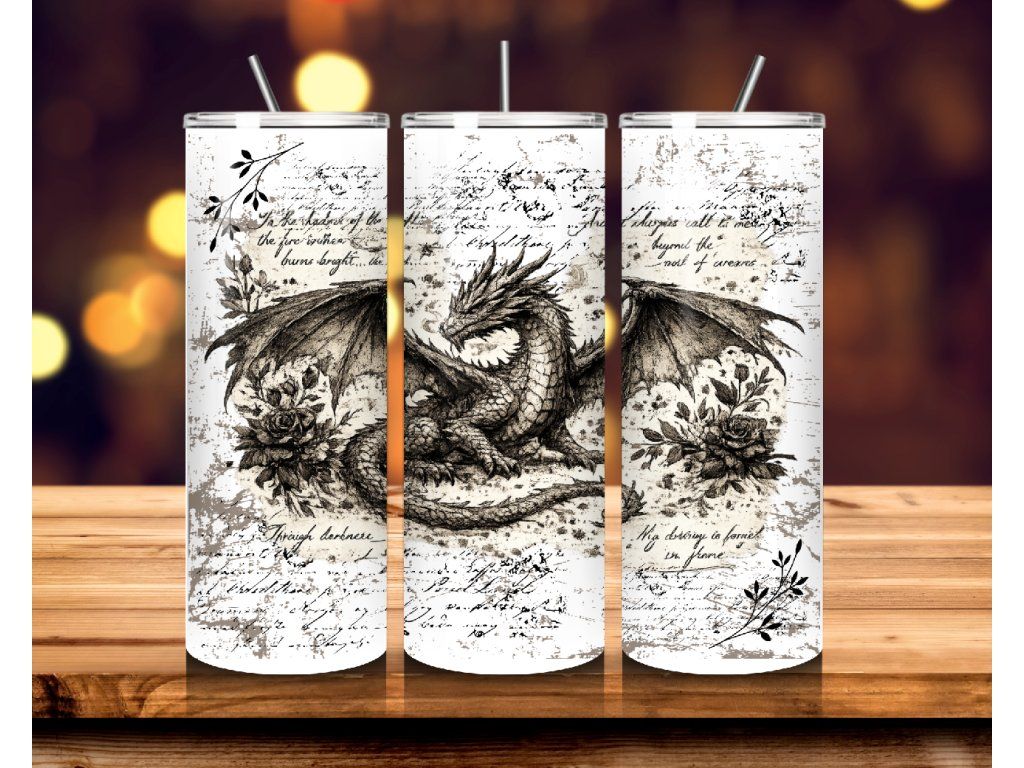 Originální termo kelímek s drakem je jako stvořený pro všechny, kdo milují fantasy svět, mystické motivy a originální doplňky s atmosférou 🐉 Design s detailně zpracovaným drakem doplněný o vintage prvky, jemné květinové detaily a strukturu starého rukopisu působí elegantně, temně a zároveň velmi stylově.