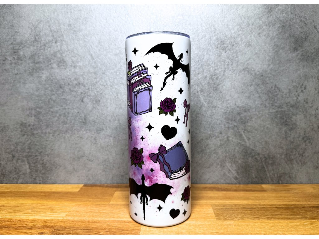 Knižní termo kelímek s motivem fantasy, draků a knih ve fialové - Originální fantasy termohrnek s draky, knihami a kouzelnými detaily. Perfektní pro milovníky magických světů 🐉📚