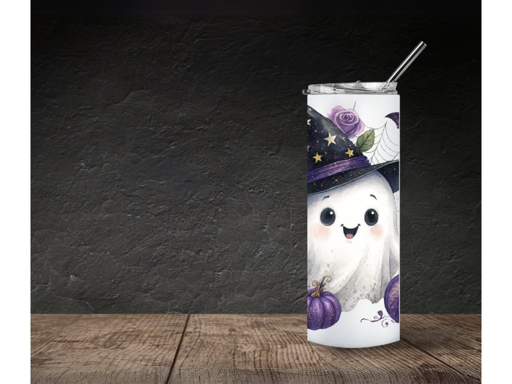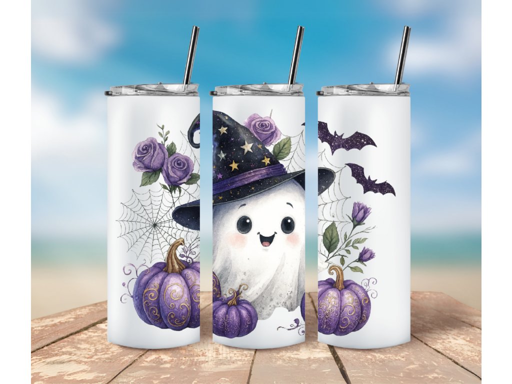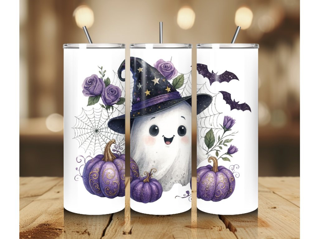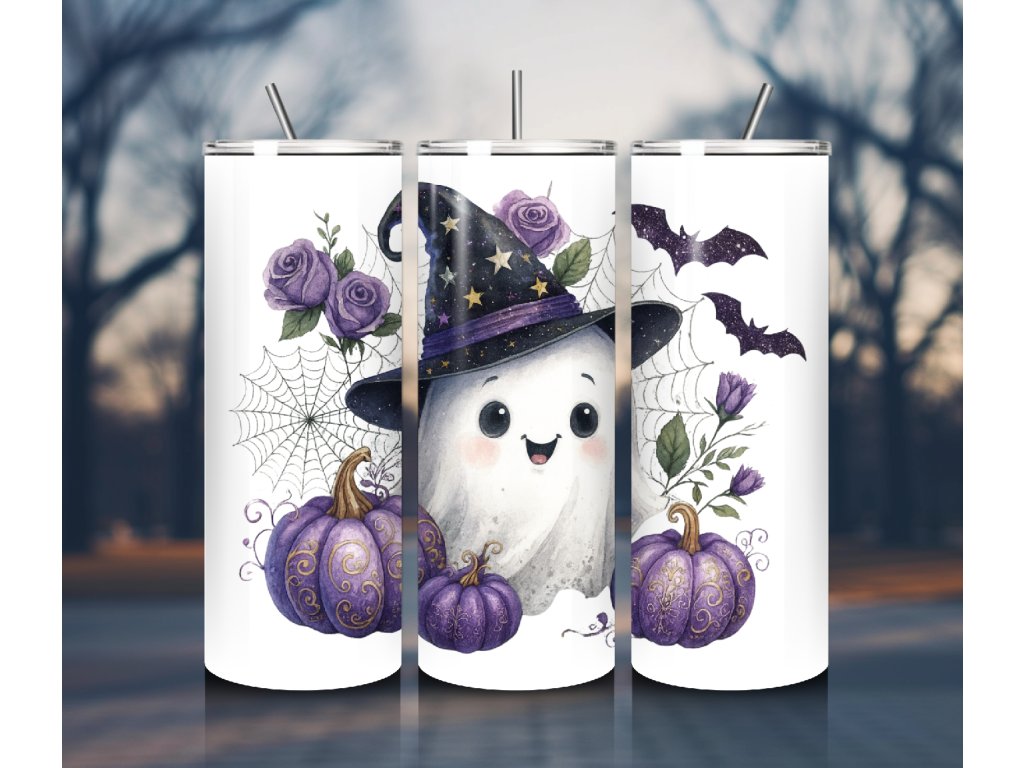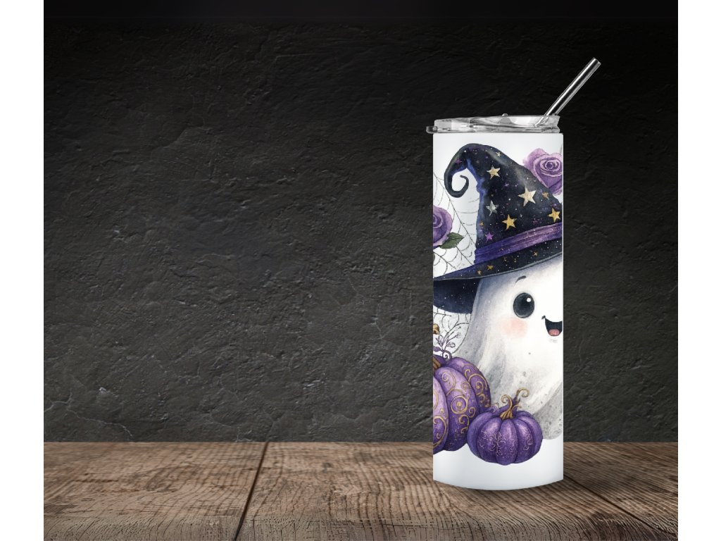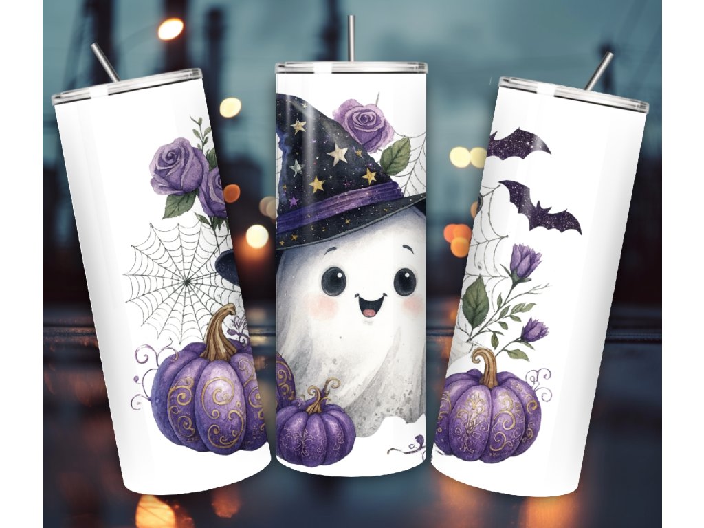 Stylový termo kelímek s roztomilým duchem, fialovými dýněmi a růžemi – ideální na podzim i Halloween 🎃👻💜