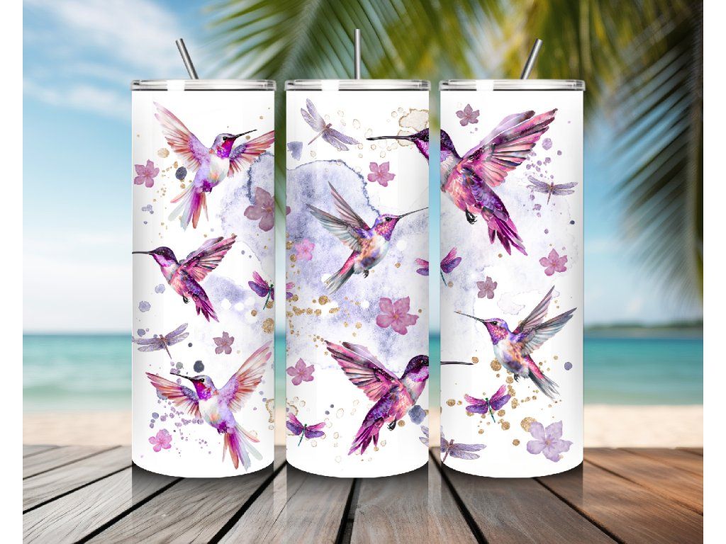 Něžný termo kelímek s akvarelovými kolibříky a květy 🐦💜 Ideální na léto, cestování i každodenní kávu to go.