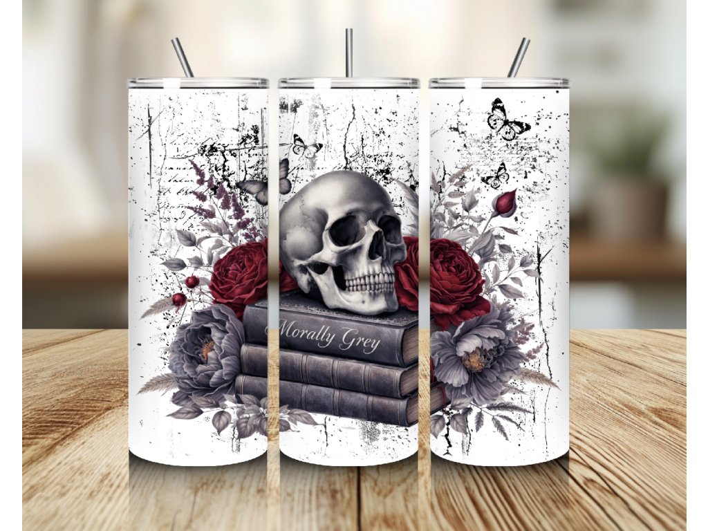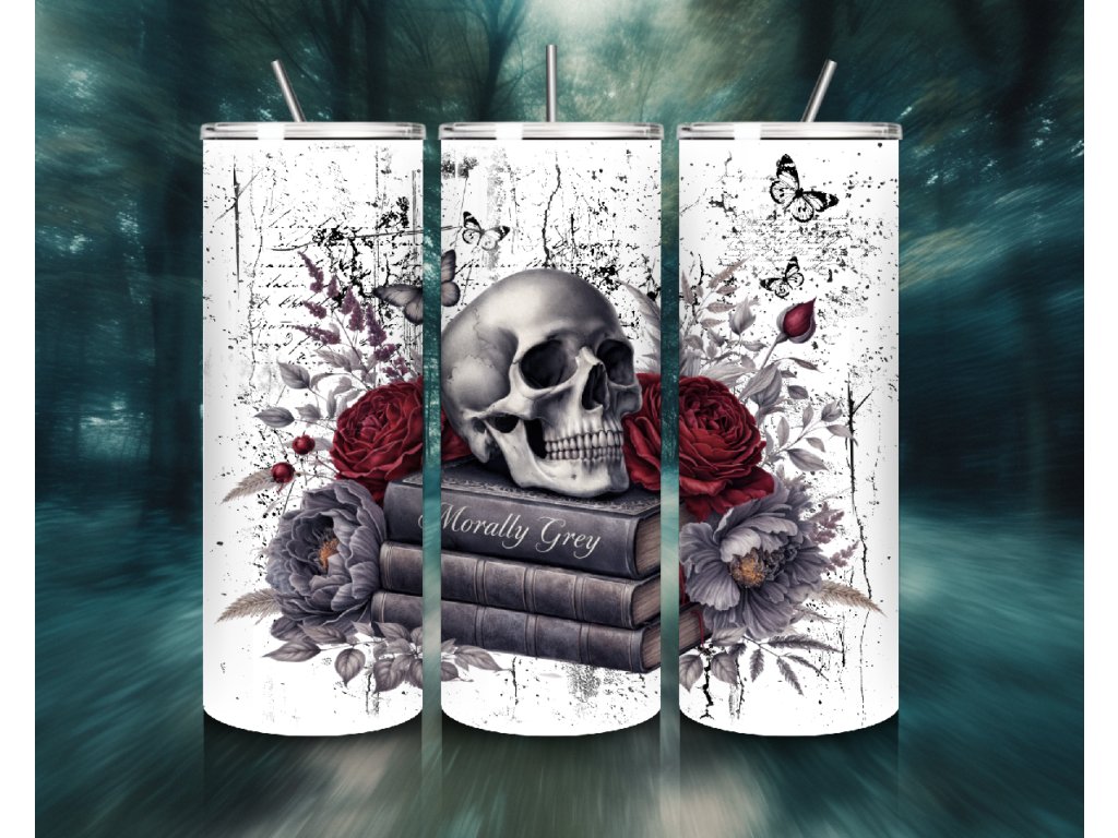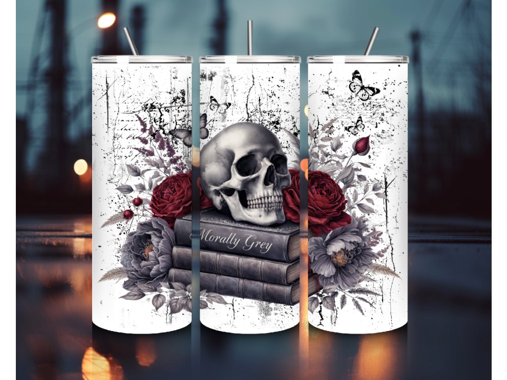 Termo kelímek Morally Grey 🖤📚 Lebka, růže a knihy v dark romance stylu – pro knihomolky, které milují morálně šedé hrdiny, dramata a příběhy s temnou atmosférou.