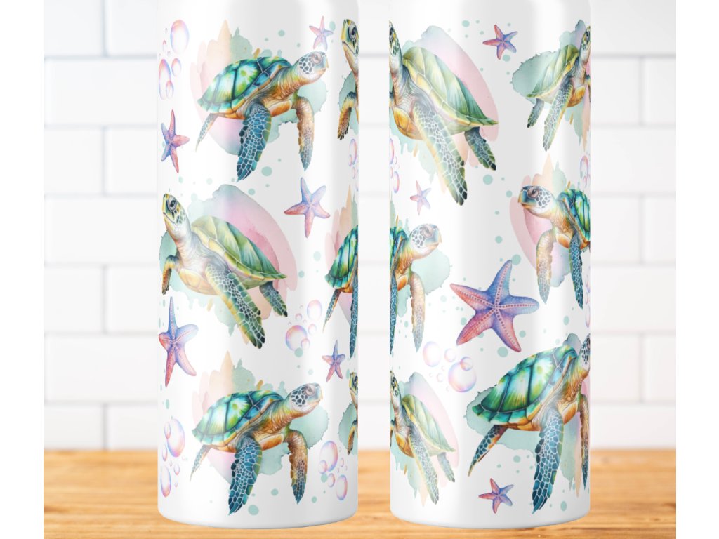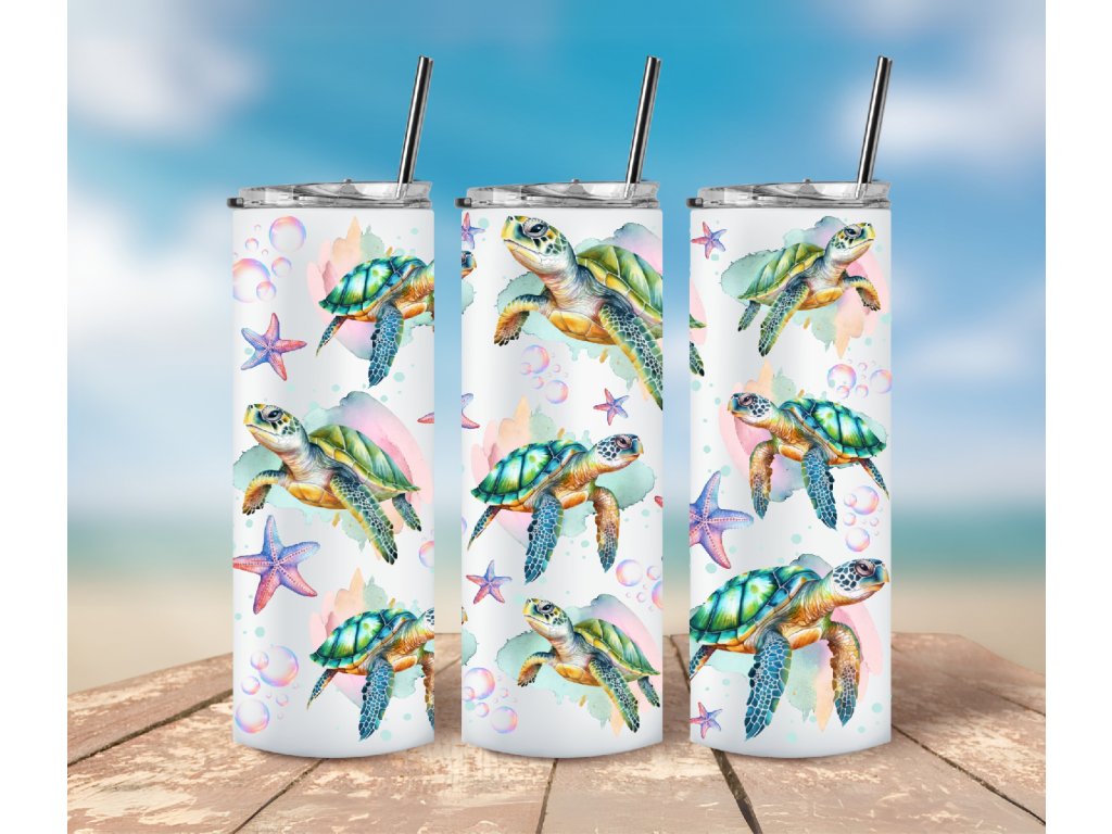 Přeneste se k moři a vychutnejte si svůj oblíbený nápoj ve stylu! 🐢🌊 Tento nádherný termo kelímek s potiskem mořských želv, hvězdic a bublinek v jemných akvarelových barvách je perfektním doplňkem pro každého, kdo miluje oceán a letní pohodu.