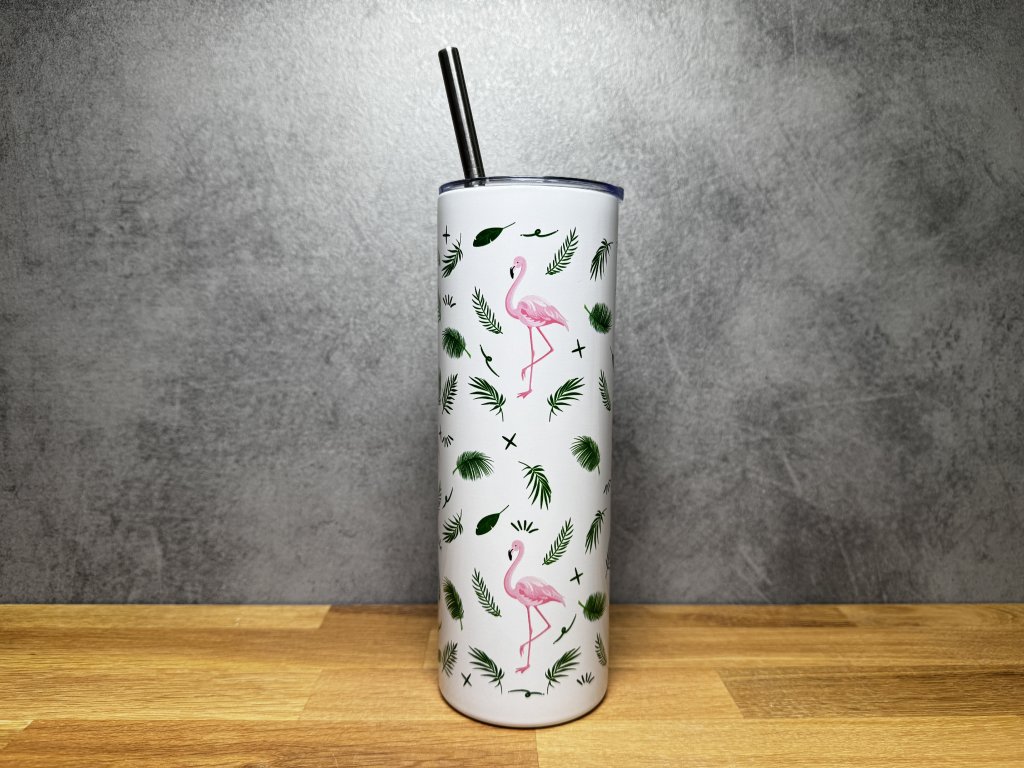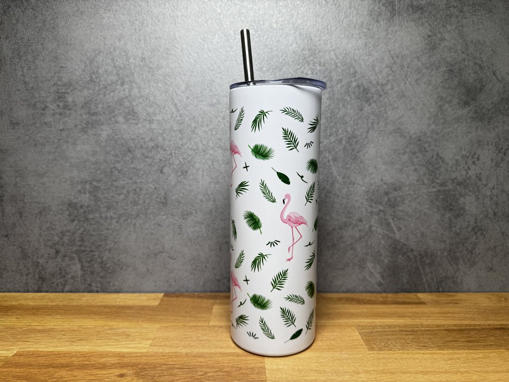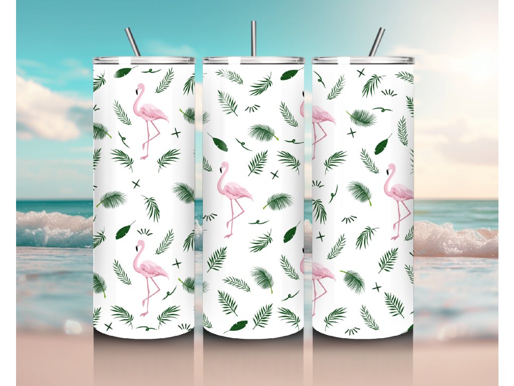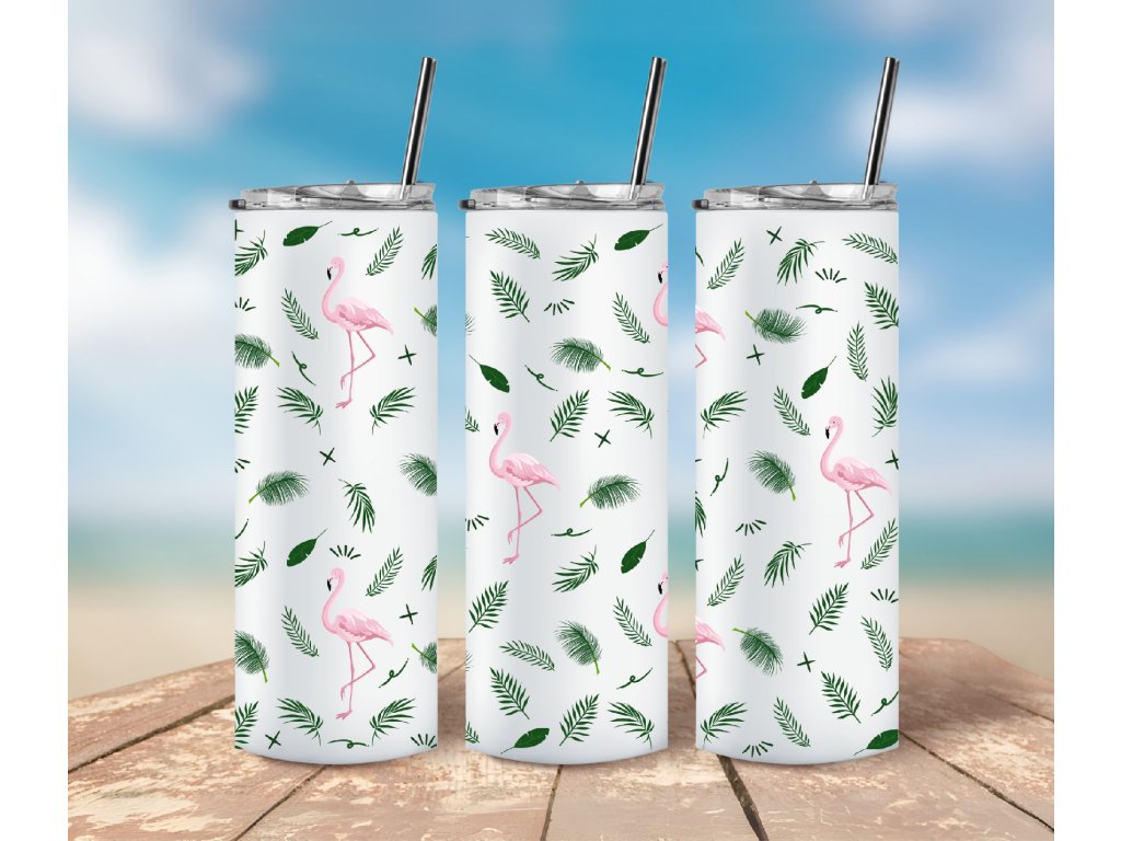 Dopřejte si kapku tropického stylu s tímto roztomilým termo kelímkem s plameňáky a zelenými listy 🌴🦩 Ideální společník na pláž, dovolenou nebo na každodenní letní pohodu.