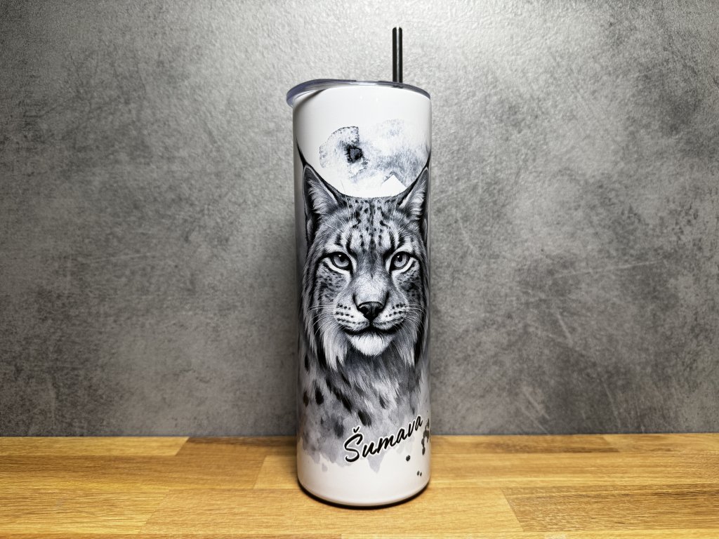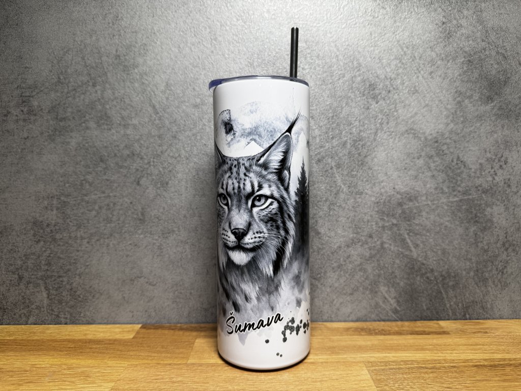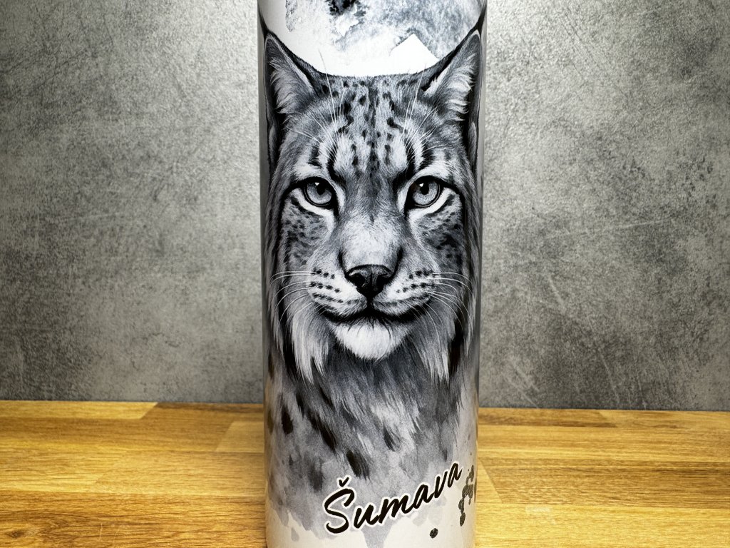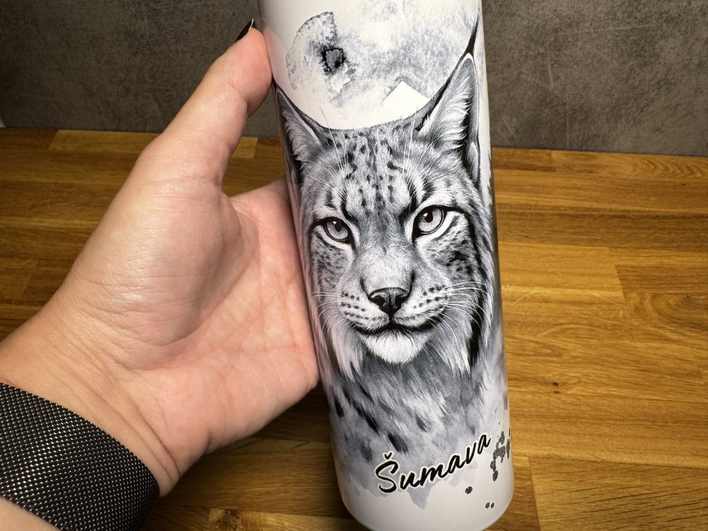 Objevte jedinečný termo kelímek s motivem rysa ostrovida, který v sobě spojuje sílu přírody a minimalistický design. Rys je symbolem divoké Šumavy a jeho detailní provedení v kombinaci s akvarelovým pozadím vytváří originální a moderní vzhled.