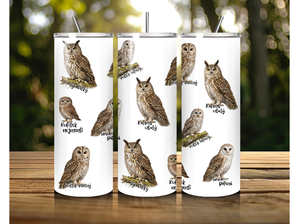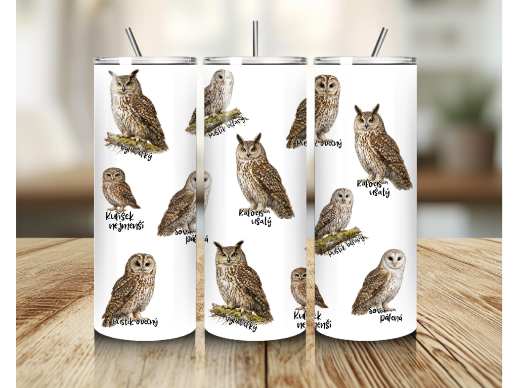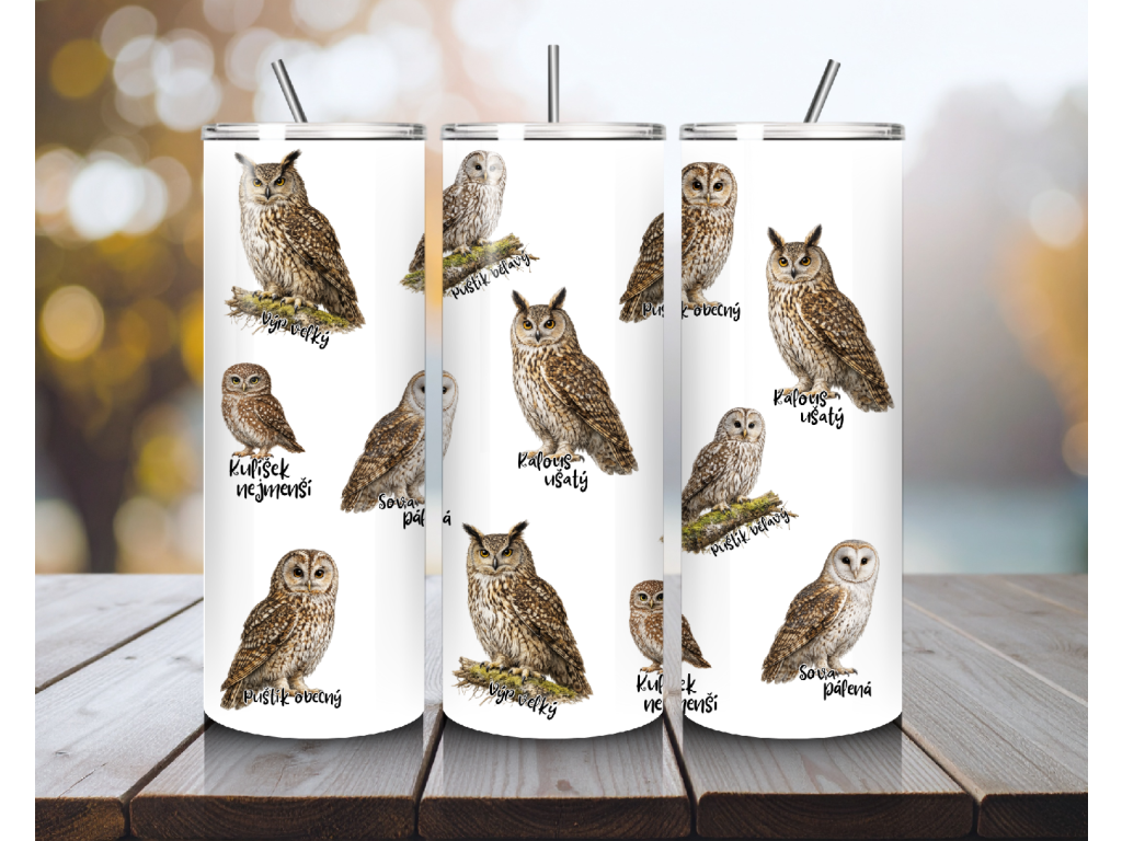 Na termo kelímku najdete ilustrace sov s jejich názvy: