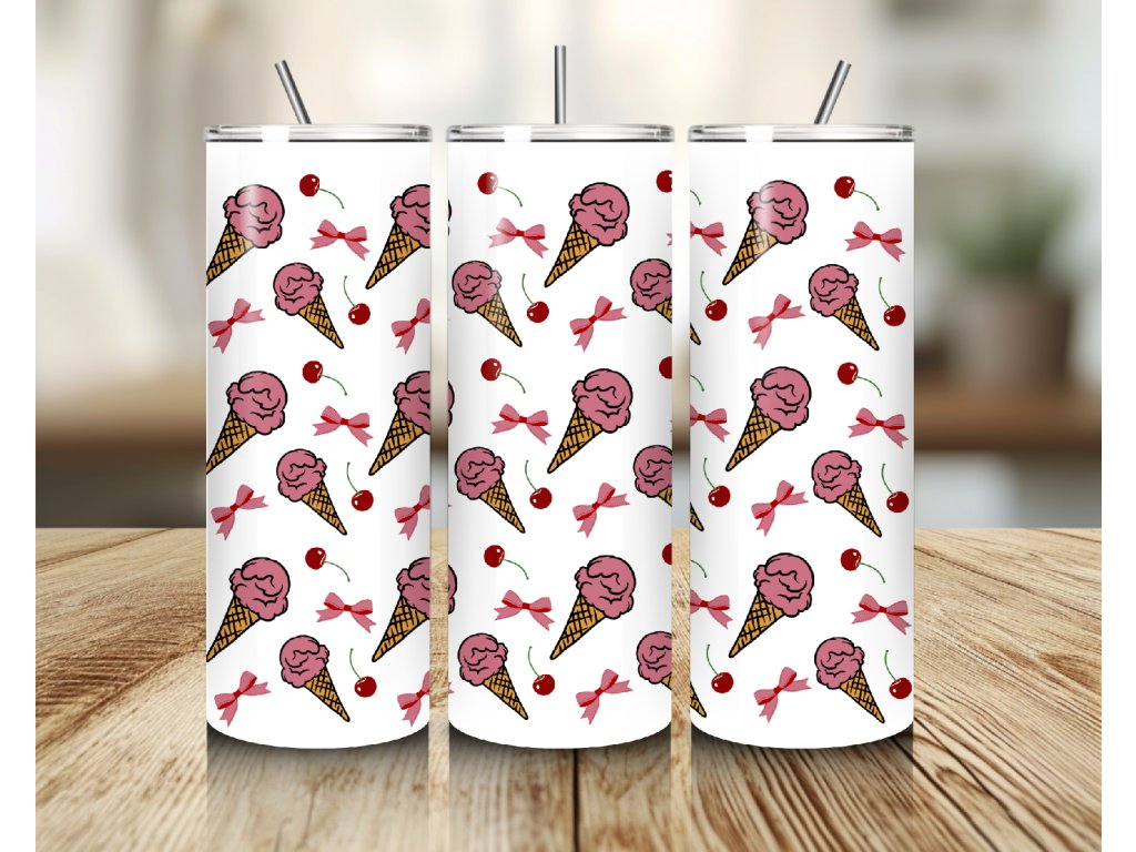Léto, sladká zmrzlina, třešničky a roztomilé mašličky 🍦🍒 Tento hravý termo kelímek s potiskem zmrzlinových kornoutků, třešní a růžových mašliček vám přinese radost každý den – nejen na pláži, ale i doma, v práci nebo na cestách.