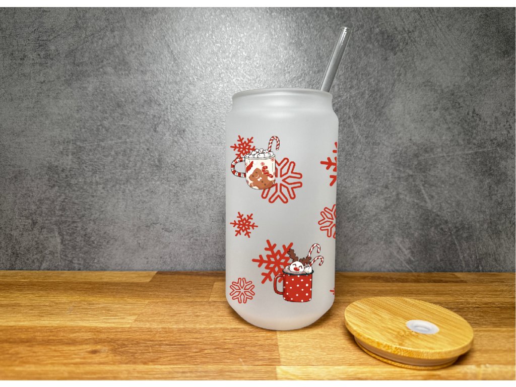 550 ml – matná (kouřová) vánoční sklenička Hot Chocolate Season ☕ Roztomilá sklenice s hrníčky kakaa, sněhovými vločkami a bambusovým víčkem.