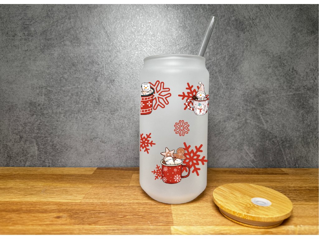 550 ml – vánoční sklenička s perníčky 🍪 Čirá sklenice ve tvaru plechovky s roztomilým vánočním motivem perníčků a sněhových vloček.