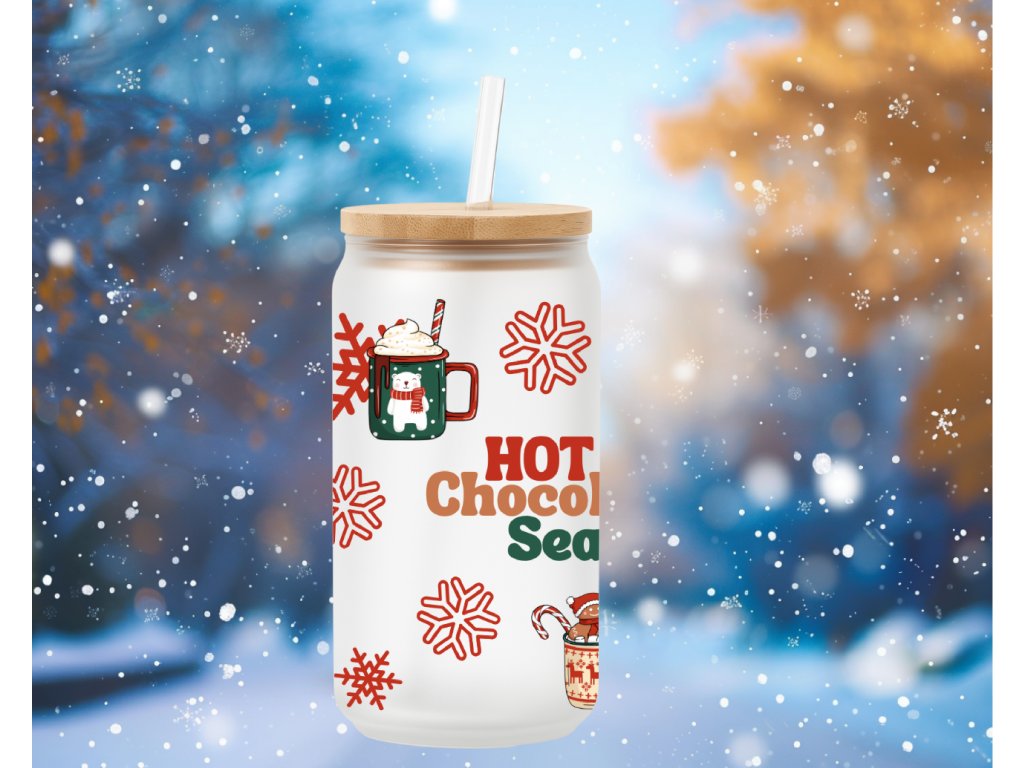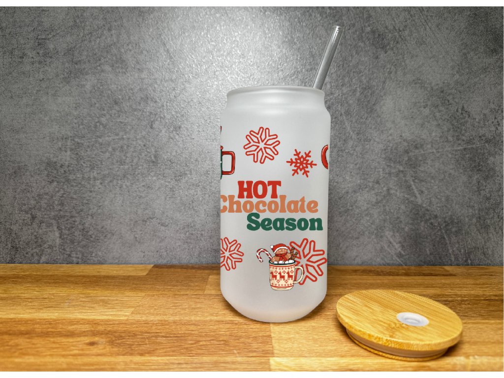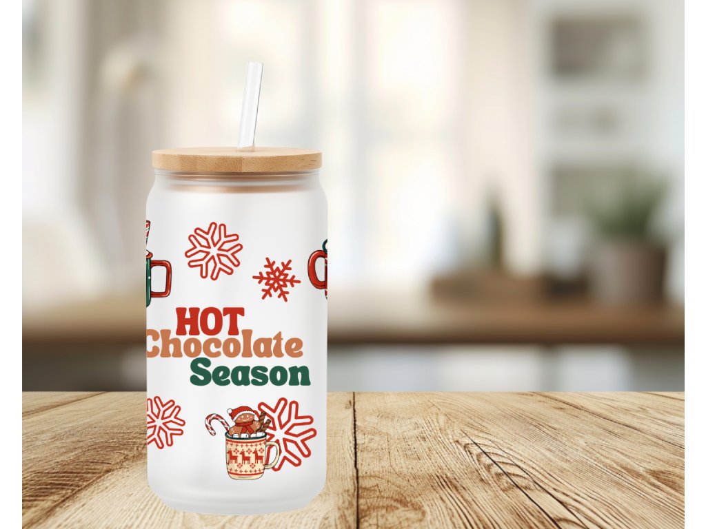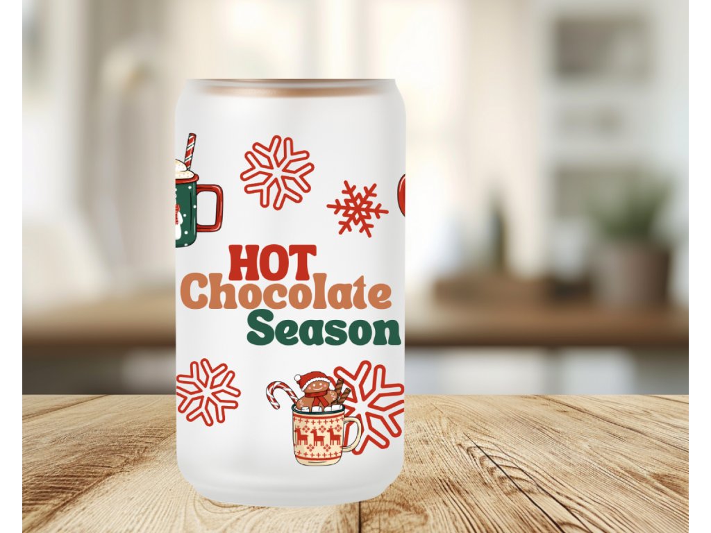 Je tu sezóna horké čokolády! ❤️ Tato vánoční sklenička s nápisem „Hot Chocolate Season“ a motivy zimních hrnků, vloček a marshmallow přináší hřejivou pohodu každému doušku.