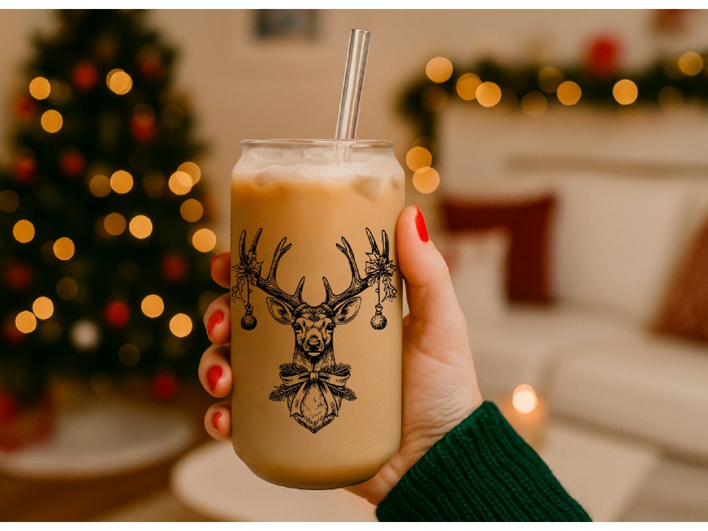 550 ml – vánoční sklenička s jelenem 🎄 Elegantní čirá sklenice ve tvaru plechovky s vánočním motivem jelena a ozdobenými parohy.