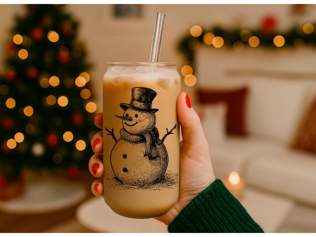 550 ml – vánoční sklenička se sněhulákem ☃️ Čirá sklenice ve tvaru plechovky s kouzelným zimním motivem sněhuláka s šálou a kloboukem.